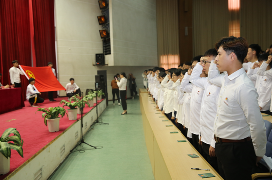 新團(tuán)員入團(tuán)儀式上,各系團(tuán)總支書記、副書記為新團(tuán)員代表佩戴團(tuán)徽、頒發(fā)團(tuán)員證。梅煊等115名新團(tuán)員在院團(tuán)委宋秋瓊老師帶領(lǐng)下,高舉右手,緊握拳頭,宣讀入團(tuán)誓詞。在場的全體團(tuán)員青年重溫入團(tuán)誓詞。闕愛勇同學(xué)作為入團(tuán)介紹人代表宣讀團(tuán)員的義務(wù)和權(quán)利,張錚同學(xué)作為新團(tuán)員代表發(fā)言。