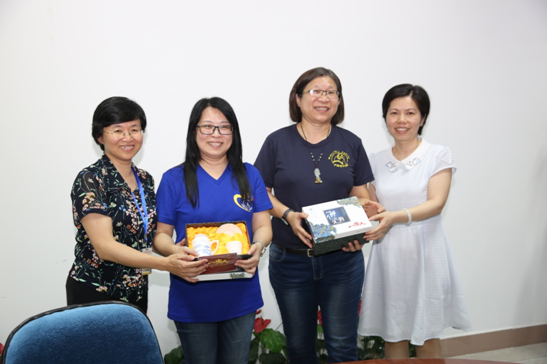 護(hù)理系謝濤書(shū)記、龔海蓉副主任與臺(tái)灣輔英科技大學(xué)廖怡惠主任互贈(zèng)禮物