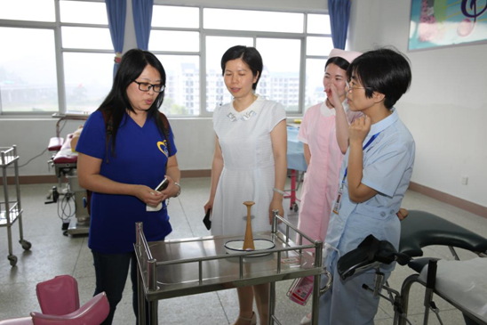 婦兒護(hù)理教研室主任陳順萍(右一)向廖怡惠主任介紹產(chǎn)科實(shí)訓(xùn)器材