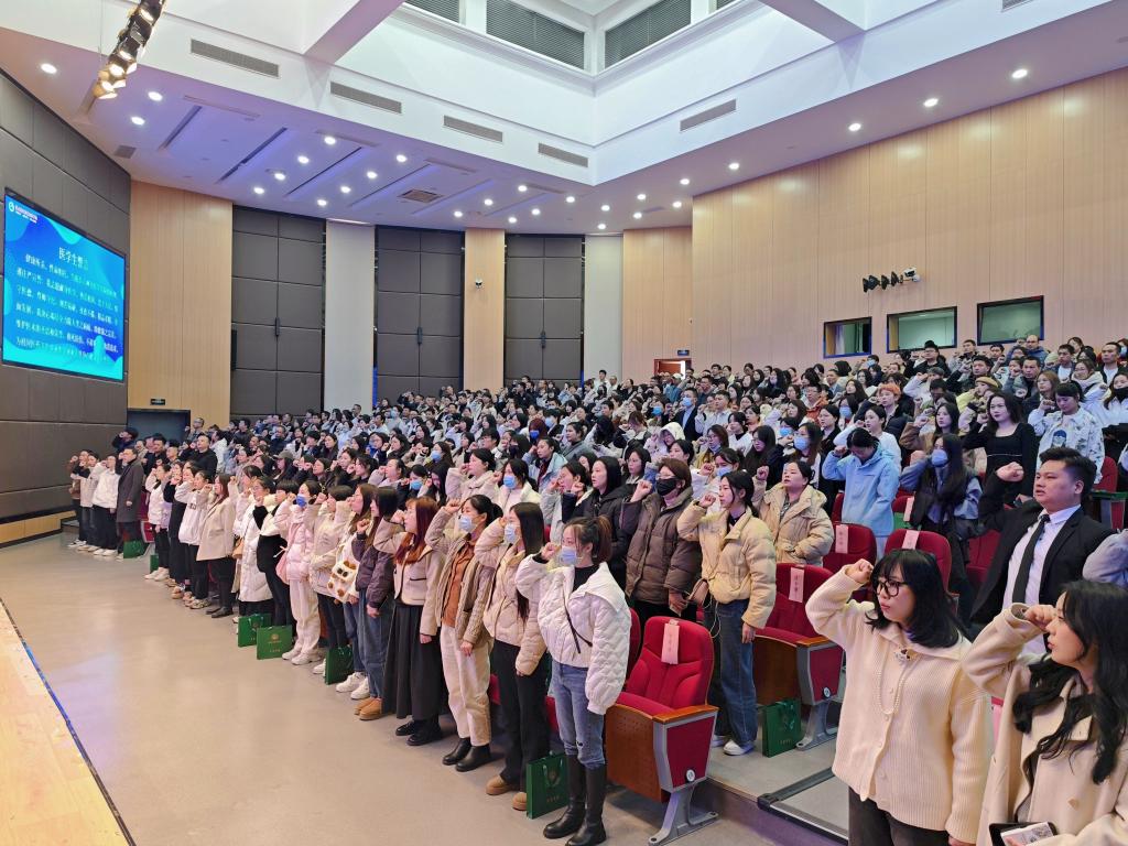 典禮上,2022級護理4班饒柳芳同學帶領(lǐng)全體畢業(yè)生重溫醫(yī)學生誓詞。拳頭緊握,誓言鏗鏘,表達了學子們不忘初心、踐行新時代醫(yī)藥衛(wèi)生職業(yè)精神的承諾。