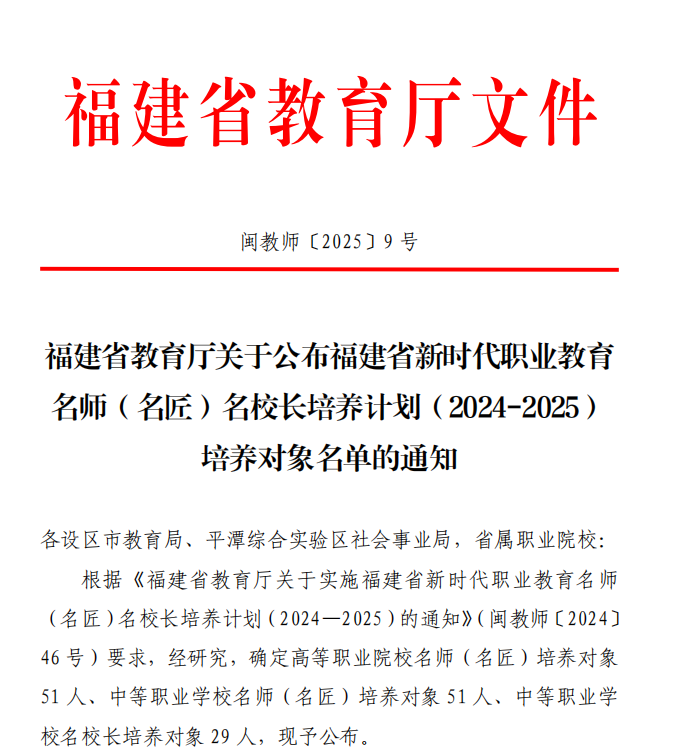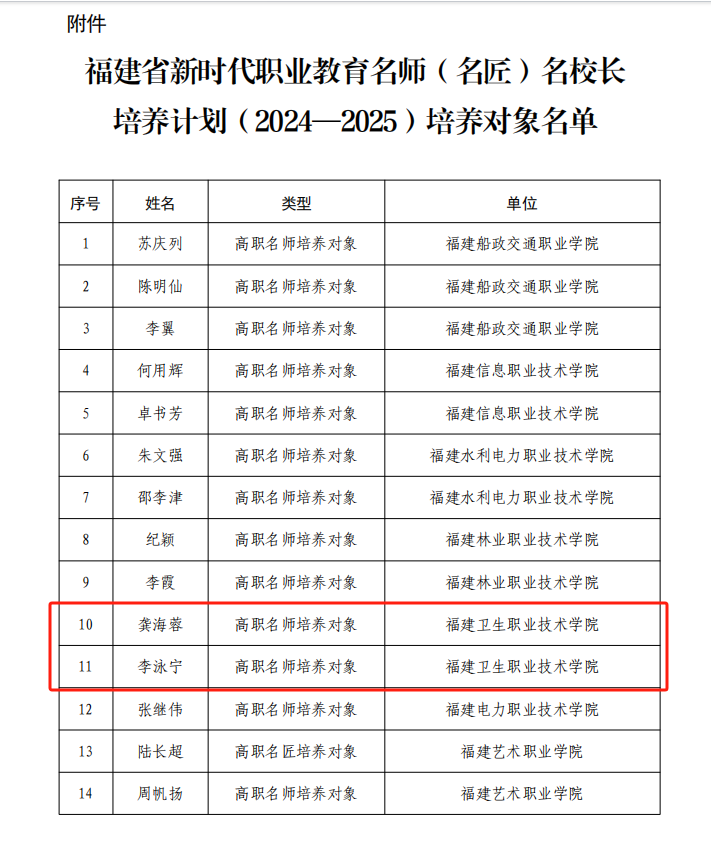 近日,福建省教育廳公布《新時(shí)代職業(yè)教育名師(名匠)名校長(zhǎng)培養(yǎng)計(jì)劃(2024-2025)培養(yǎng)對(duì)象名單》,我校龔海蓉、李泳寧兩位教師成功入選福建省新時(shí)代職業(yè)教育高職名師培養(yǎng)對(duì)象。