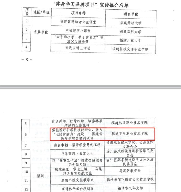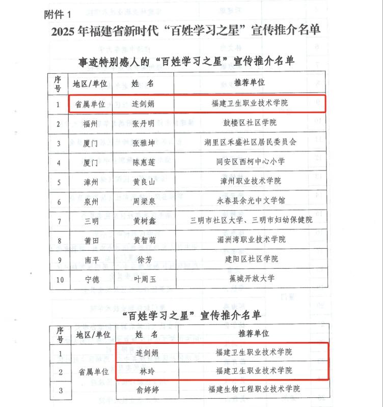 近日,福建省終身教育促進(jìn)委員會公布2025年“百姓學(xué)習(xí)之星”和“終身學(xué)習(xí)品牌項目”推介名單。我校護(hù)理學(xué)院連劍娟老師、藥學(xué)院林玲老師入選“百姓學(xué)習(xí)之星”,其中連劍娟老師更是躋身全省10位事跡特別感人的“百姓學(xué)習(xí)之星”行列。繼續(xù)教育學(xué)院和護(hù)理學(xué)院聯(lián)合申報的《強(qiáng)化醫(yī)療護(hù)理員技能培訓(xùn),助力“無陪護(hù)病房”建設(shè)——福建省醫(yī)療護(hù)理員培訓(xùn)項目》入選“終身學(xué)習(xí)品牌項目”。