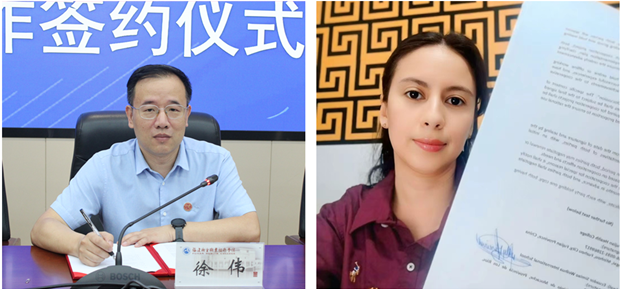 為服務(wù)“一帶一路”建設(shè),促進(jìn)中國(guó)與拉共體(拉美和加勒比國(guó)家共同體)成員國(guó)在教育文化交流、衛(wèi)生健康等領(lǐng)域的合作,5月19日上午,我校與厄瓜多爾玻利瓦爾大學(xué)、厄瓜多爾思邈維華國(guó)際學(xué)校舉行合作協(xié)議線(xiàn)上簽約儀式。厄瓜多爾玻利瓦爾大學(xué)校方代表、厄瓜多爾思邈維華國(guó)際學(xué)校創(chuàng)始人梅炬銘、校長(zhǎng)內(nèi)莉、副校長(zhǎng)張瑜鋒,我校校長(zhǎng)徐偉、副校長(zhǎng)朱扶蓉,黨政辦公室、教務(wù)處、藥學(xué)院、醫(yī)學(xué)院負(fù)責(zé)人出席簽約儀式。
