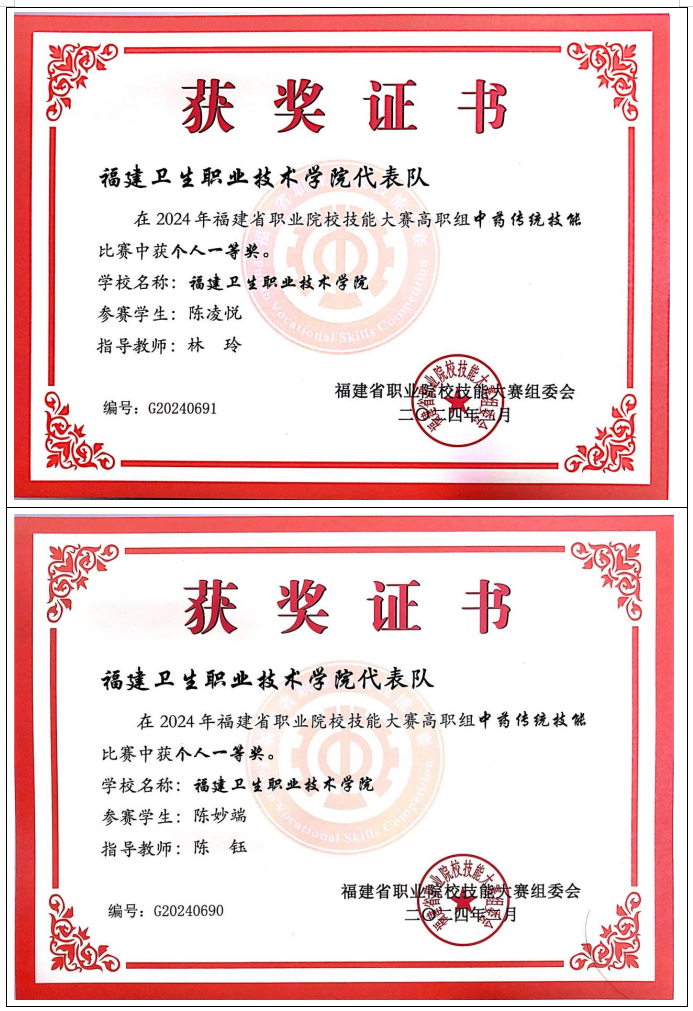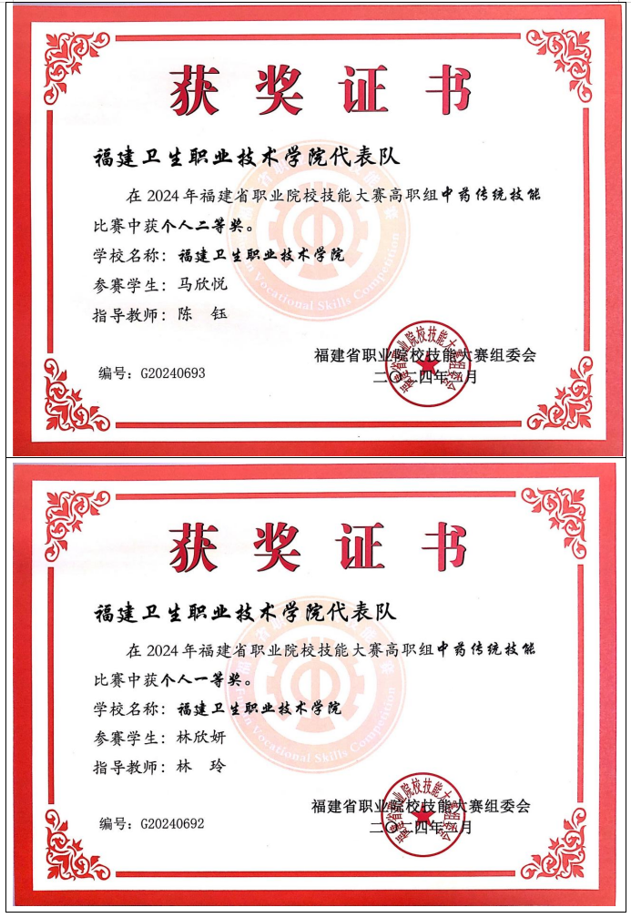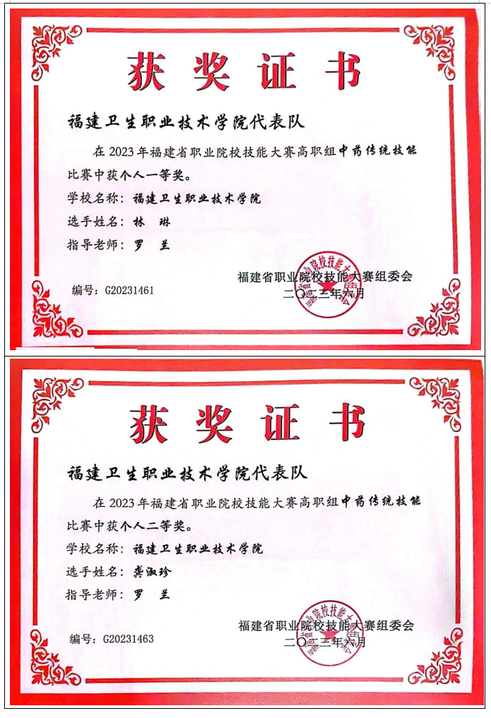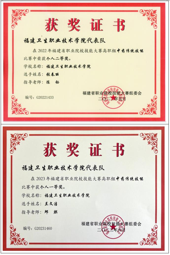 2012年起,專業(yè)教師指導學生參加中藥傳統(tǒng)技能競賽共計獲得全國一等獎2項,二等獎4項,三等獎 2項;省級一等獎10項,二等獎16項,三等獎13項。