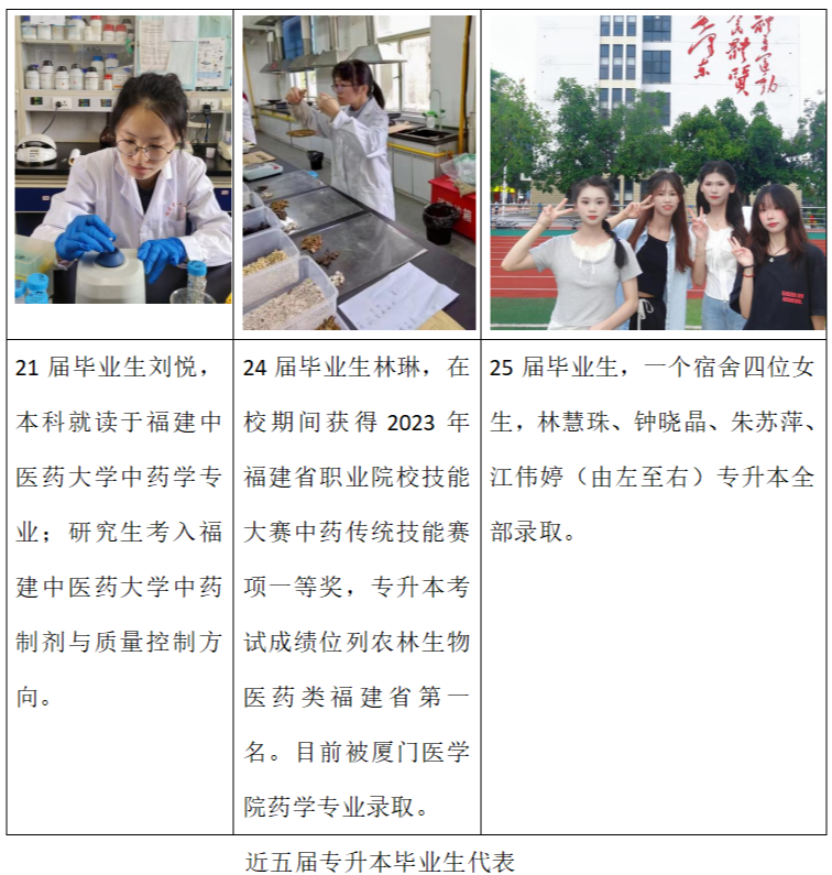 升學率:已培養(yǎng)12屆畢業(yè)生,2020~2024年應屆畢業(yè)生參加專升本考試錄取率達15%以上。2025年中藥學專業(yè)學生被本科高校錄取人數(shù)30名,占比20%以上。