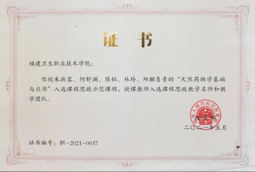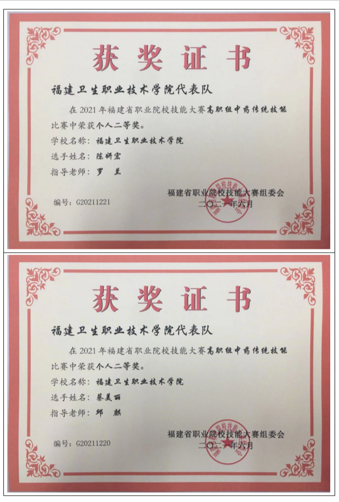 《中藥學、藥學專業(yè)校企協(xié)同培養(yǎng)技術技能型人才培養(yǎng)模式的探索與實踐》,獲2017年福建省職業(yè)教育教學成果一等獎 |