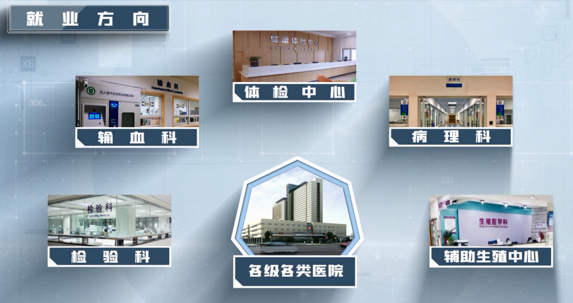 學生畢業(yè)后可面向各級各類醫(yī)院的檢驗科、輸血科、體檢中心、病理科、輔助生殖中心。第三方醫(yī)學檢驗中心、各級疾病預防控制中心、血站/血液中心。醫(yī)療器械公司、生物技術公司、試劑公司、計劃生育服務站、檢驗檢疫局、商品檢驗機構、科研機構實驗室等就業(yè)。近三年畢業(yè)生就業(yè)率達98%以上。