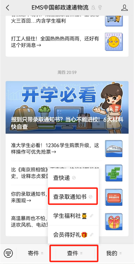 學(xué)校統(tǒng)一采用中國郵政EMS郵寄錄取通知書,考生和家長可以通過微信搜索“EMS中國郵政速遞物流”公眾號,點擊“查件”,選擇“查錄取通知書”,并根據(jù)提示輸入考生號進行查詢即可!