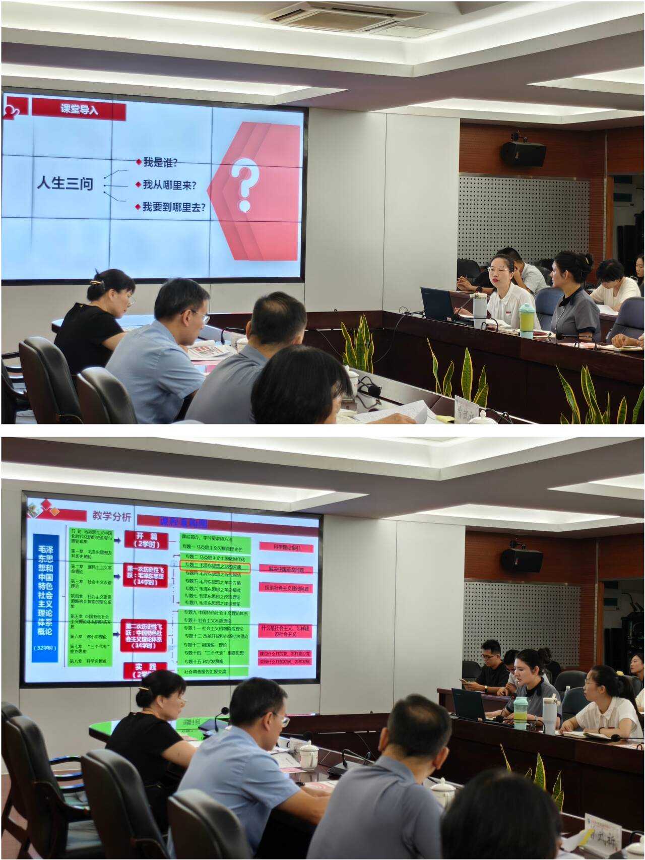 集備會(huì)上,顏冰鳳老師圍繞《思想道德與法治》課程專題二“領(lǐng)悟人生真諦 把握人生方向”進(jìn)行教學(xué)展示。她以“人生三問”搭建邏輯框架,設(shè)置問題鏈層層追問,引導(dǎo)學(xué)生自主思考;以福建特色案例與閩衛(wèi)青年的校本案例觸動(dòng)學(xué)生情感,推動(dòng)價(jià)值引導(dǎo)落地生根,實(shí)現(xiàn)從理論認(rèn)知到價(jià)值認(rèn)同的轉(zhuǎn)化。邱萍老師展示《毛澤東思想和中國特色社會(huì)主義理論體系概論》專題三“毛澤東思想之活的靈魂。她以“走近毛澤東”為切入點(diǎn),通過任務(wù)驅(qū)動(dòng)法、信息化教學(xué)法、故事化教學(xué)法及情景教學(xué)法,結(jié)合大量詳實(shí)的歷史資料,生動(dòng)展現(xiàn)實(shí)事求是、群眾路線、獨(dú)立自主在革命實(shí)踐中的具體體現(xiàn)與重要作用。與會(huì)教師聚焦課堂教學(xué)的吸引力、感染力和實(shí)效性,錨定學(xué)生學(xué)情、教學(xué)重難點(diǎn)突破,展開熱烈研討,現(xiàn)場(chǎng)氣氛活躍,思維碰撞不斷。