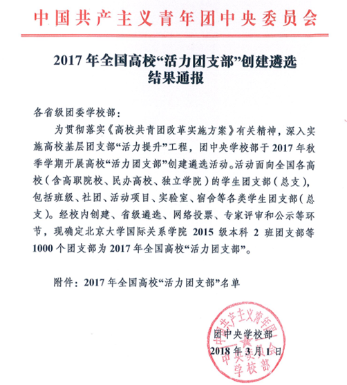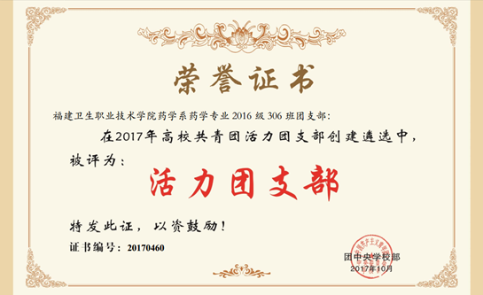 近日,團(tuán)中央公布了2017年全國(guó)高?!盎盍F(tuán)支部”名單,我院藥學(xué)系藥學(xué)專業(yè)2016級(jí)306班團(tuán)支部獲評(píng)全國(guó)高?!盎盍F(tuán)支部”稱號(hào)。此次評(píng)選經(jīng)校內(nèi)創(chuàng)建、省級(jí)遴選、網(wǎng)絡(luò)投票、專家評(píng)審和公示等環(huán)節(jié),共確定1000個(gè)團(tuán)支部為2017年全國(guó)高校“活力團(tuán)支部”。福建省共入選35個(gè)團(tuán)支部,其中本科高校32個(gè),高職院校3個(gè)。我院2016級(jí)藥學(xué)306班團(tuán)支部憑借自身實(shí)力成功入選。