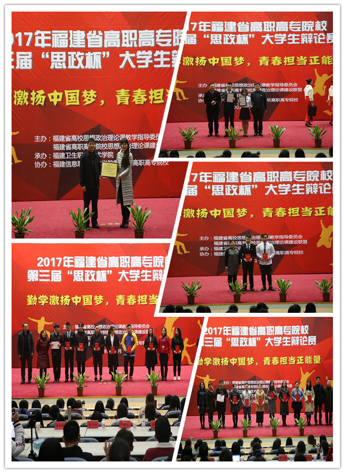 賽后頒獎(jiǎng)典禮上,福建省高職高專院校思想政治理論課建設(shè)聯(lián)盟秘書長、福建信息職業(yè)技術(shù)學(xué)院黨委書記林杰為本次比賽閉幕式致辭。出席本次比賽的領(lǐng)導(dǎo)和嘉賓——福建衛(wèi)生職業(yè)技術(shù)學(xué)院黨委書記曾武祈、福建省高職高專院校思想政治理論課建設(shè)聯(lián)盟秘書長魏立娜教授、常務(wù)副秘書長黃冬福教授,超星集團(tuán)福建省市場總監(jiān)朱曉磊以及各高職高專院校思政理論課負(fù)責(zé)人上臺(tái)為獲獎(jiǎng)學(xué)校、辯手及老師頒獎(jiǎng)。