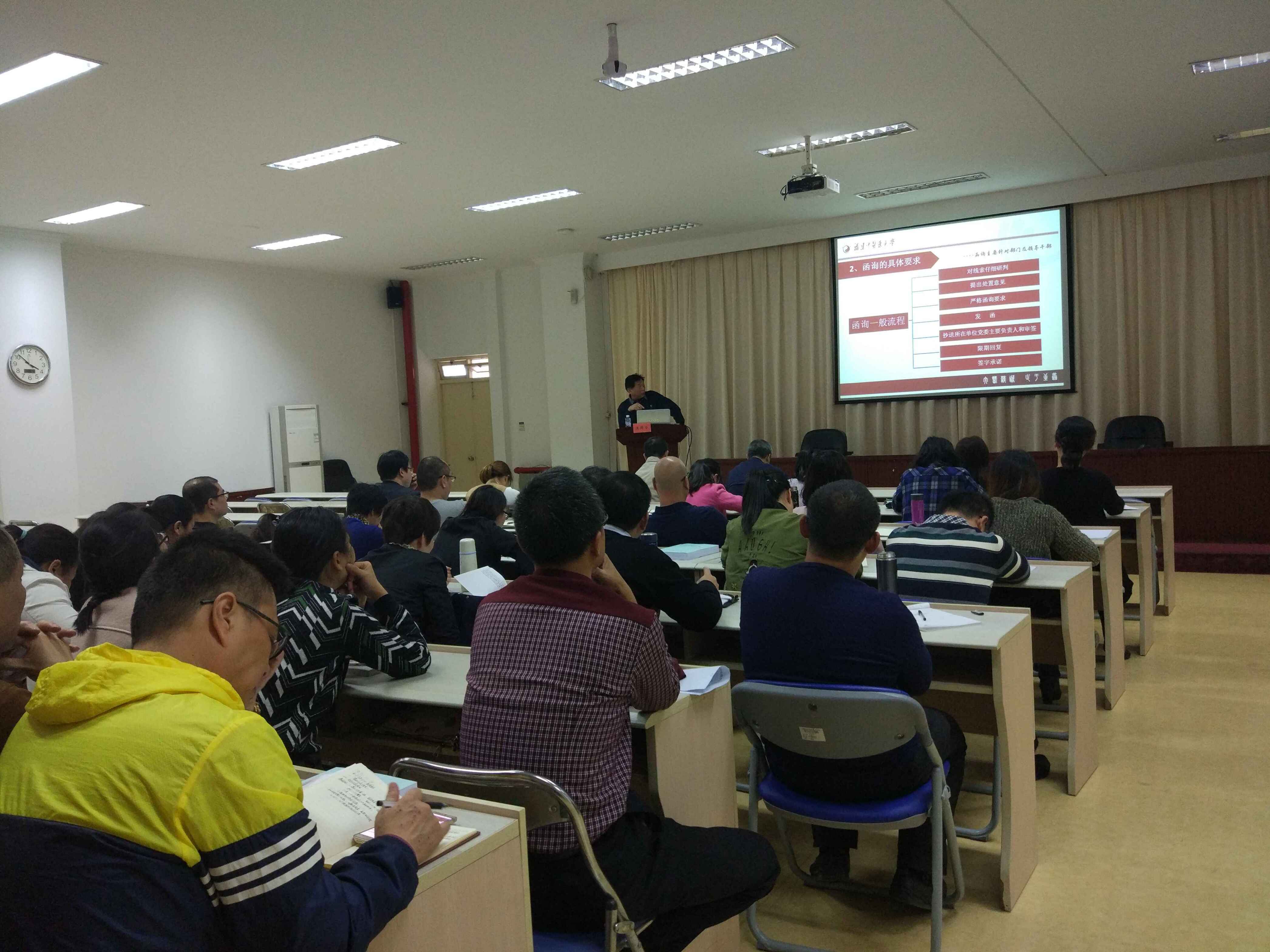 沐得力書記的培訓講座圍繞監(jiān)督執(zhí)紀工作的沿革、監(jiān)督執(zhí)紀工作的主要內(nèi)容和新時期做好監(jiān)督執(zhí)紀工作需要注意的問題為主要內(nèi)容展開,結(jié)合學習十九大精神與貫徹執(zhí)行《中國共產(chǎn)黨紀律檢查機關(guān)監(jiān)督執(zhí)紀工作規(guī)則(試行)》,闡述了十八大以來黨風廉政建設(shè)和反腐敗工作取得的成效、紀檢監(jiān)察部門職能轉(zhuǎn)變以及監(jiān)督執(zhí)紀“四種形態(tài)”的把握和運用,詳細地介紹了信訪處理、問題線索管理、執(zhí)紀審查等方面的業(yè)務(wù)辦理工作。最后,沐書記結(jié)合自己多年來對高校紀檢監(jiān)察工作的理論研究和經(jīng)驗實踐,強調(diào)了高校監(jiān)督執(zhí)紀工作應(yīng)注意把握好四個方面的關(guān)系。