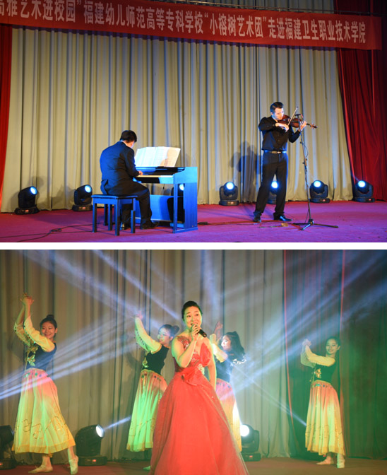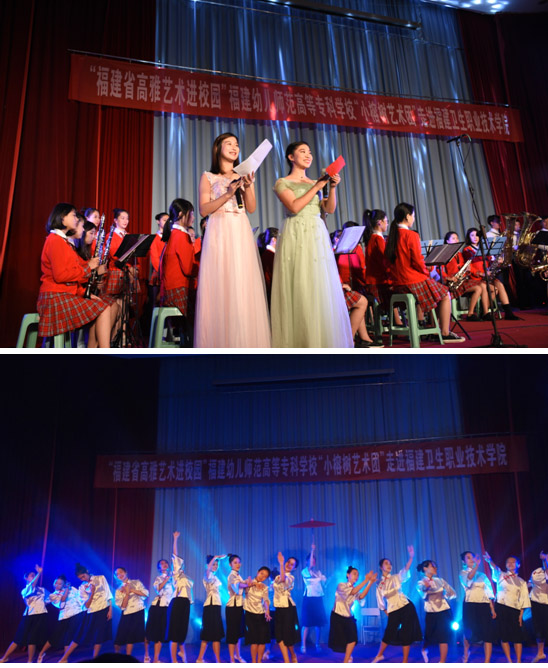 福建幼兒師范高等??茖W?!靶¢艠渌囆g團”為我院師生帶來了一場藝術盛宴:管樂合奏《Mission Impossible》《Accidentally in love》拉開帷幕;舞蹈《坊巷芳華》更是韻味十足;肖豆豆老師的女聲獨唱《一杯美酒》作為壓軸,將演出推向高潮。新穎多樣的節(jié)目表演出色地表現(xiàn)了高雅藝術的獨特魅力,也把幼兒高等??茖W校學子的藝術細胞展現(xiàn)得淋漓盡致。