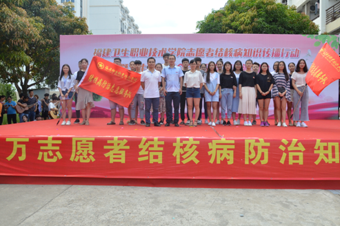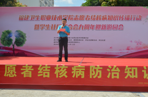在院黨委林建團(tuán)副書記致辭后,閩侯縣疾控中心江仁銜主任現(xiàn)場介紹了結(jié)核病在我國的傳播情況,并為志愿者加油鼓勁。隨后,江仁銜主任和院團(tuán)委黃曦副書記一同為兩支結(jié)核病防治志愿者服務(wù)隊授旗。管理系王國浩老師在現(xiàn)場進(jìn)行了結(jié)核病防治知識宣教。