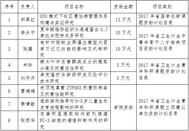 根據(jù)《福建省衛(wèi)生計(jì)生委關(guān)于下達(dá)2017年省衛(wèi)生計(jì)生科研人才培養(yǎng)項(xiàng)目資助計(jì)劃的通知》文件,我院共8個(gè)項(xiàng)目列入省衛(wèi)計(jì)委2017年省衛(wèi)生計(jì)生科研人才培養(yǎng)項(xiàng)目計(jì)劃。