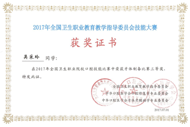 我院臨床醫(yī)學(xué)系派出2015級(jí)口腔醫(yī)學(xué)專業(yè)4名選手參加牙體制備組、雕牙和排牙組的比賽,獲得了可喜的成績(jī)。其中,黃珊珊同學(xué)和吳采玲同學(xué)分別榮獲牙體制備組一等獎(jiǎng)和三等獎(jiǎng),鄭少東、李亞廷同學(xué)均榮獲雕牙和排牙組三等獎(jiǎng)。此外,黃珊珊同學(xué)還榮獲窩洞制備單項(xiàng)獎(jiǎng)三等獎(jiǎng)。