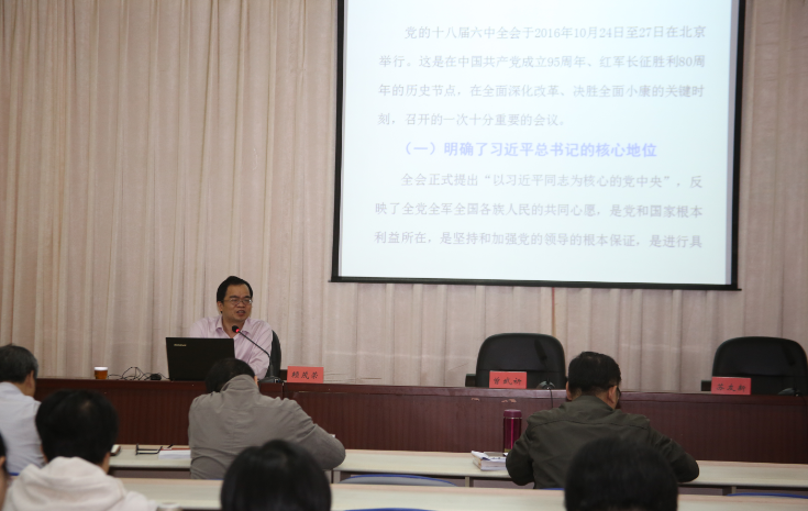 賴團長首先闡述黨的十八屆六中全會精神的重大意義:明確了習(xí)近平總書記的核心地位,開創(chuàng)了黨的建設(shè)新格局和新境界,作出了召開黨的十九大的決議;接著重點闡釋了《關(guān)于新形勢下黨內(nèi)政治生活的若干準則》的十三個重要觀點和重大舉措,以及《中國共產(chǎn)黨黨內(nèi)監(jiān)督條例》的七個新要求和新舉措;最后他指出,《準則》和《條例》都強調(diào)以高級干部為重點,要突出抓好領(lǐng)導(dǎo)干部特別是高級干部這個“關(guān)鍵少數(shù)”:準則提出要制定高級干部貫徹落實本準則的實施意見,指導(dǎo)和督促高級干部和遵守和執(zhí)行黨內(nèi)政治生活準則上作全黨表率;條例專門就黨的中央組織的監(jiān)督單設(shè)一章,是對舊條例的突破,體現(xiàn)黨中央以身作則、以上率下。
