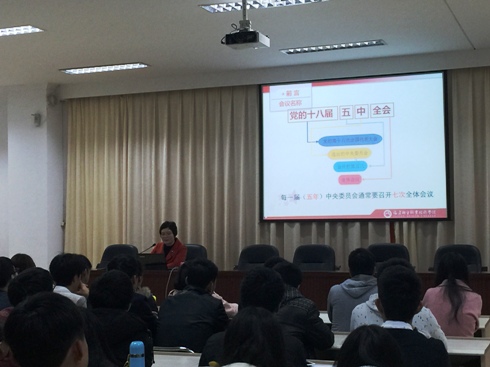 12月24日下午,院長(zhǎng)郭素華教授為師生講授思政課,題為《聚焦十八屆五中全會(huì)學(xué)習(xí)“十三五”規(guī)劃》,全體思政課教師和百余名學(xué)生到場(chǎng)聆聽(tīng)。
