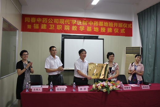 授牌儀式上,郭素華院長把刻有“福建衛(wèi)生職業(yè)技術學院教學基地”的牌匾授給林群總經(jīng)理,標志著我院福州同春中藥有限公司教學基地正式成立。