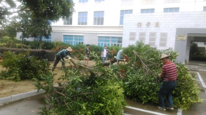 臺(tái)風(fēng)“蘇迪羅”過境后,后勤處和物業(yè)部門及時(shí)清理路障,清掃斷枝落葉、扶救傾倒樹木,盡快讓校園恢復(fù)往日的整潔、美麗。(黨委工作部)