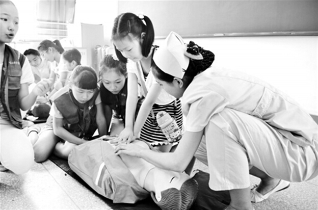 在壓軸的心肺復(fù)蘇教學(xué)環(huán)節(jié),小記者們在王老師的講解和指導(dǎo)下,開始有模有樣地進(jìn)行練習(xí)。