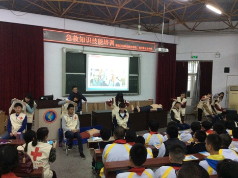 為了辦好這次實踐活動,學院團委邀請我院紅十字志愿者、省紅會急救培訓師葉榕副教授進行授課。葉榕副教授根據(jù)授課學生是初中學生這一特點,對授課內容仔細斟酌,甄選了青少年急救知識技能中最重要的內容進行講授。理論知識講解完畢后,第三期青馬班的紅十字救護員們就徒手心肺復蘇、創(chuàng)傷救護繃帶、三角巾止血等操作技能進行現(xiàn)場示范,并指導十五中學生進行分段性學習。十五中的學生們紛紛上臺操作,親身體驗了人生第一次的心肺復蘇操作,我院志愿者們一一耐心指導,直至他們能夠理解和掌握。