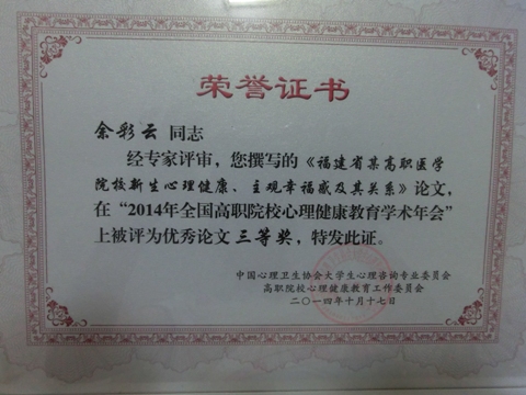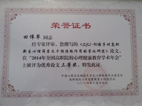 2014年10月16—17日,心理健康教育中心田偉翠老師參加了于上海舉行的“2014年全國高職院校心理健康教育學(xué)術(shù)年會暨表彰大會”。會中,接中國心理衛(wèi)生協(xié)會大學(xué)生心理咨詢專業(yè)委員會高職院校心理健康教育工作委員會下發(fā)的全國高職心教(2014)4號文件,我院送審的三篇學(xué)術(shù)論文榮獲“2014年度全國高職院校心理健康教育優(yōu)秀論文”表彰,其中田偉翠老師撰寫的兩篇論文《高職新生心理健康狀況比較研究》、《SCL-90因子對高職新生心理篩查及干預(yù)特殊作用的量化研究》分別榮獲二等獎、三等獎,余彩云老師撰寫的論文《福建省某高職醫(yī)學(xué)院校新生心理健康、主觀幸福感及其關(guān)系》榮獲三等獎。(公共基礎(chǔ)部)