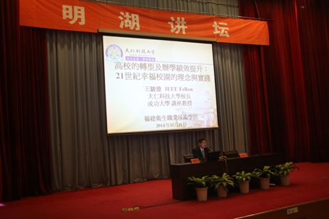 11月11日下午,臺灣大仁科技大學(xué)王駿發(fā)校長蒞臨我院,在學(xué)院學(xué)術(shù)廳舉辦了“高校的轉(zhuǎn)型及辦學(xué)績效提升:21世紀(jì)幸福校園的理念與實(shí)踐”專題講座。講座由郭素華院長主持,學(xué)院領(lǐng)導(dǎo)及300多位教職工聆聽了講座。