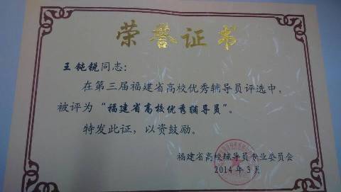 另悉,經(jīng)福建省高等學(xué)校思想政治教育研究會(huì)高校輔導(dǎo)員專業(yè)委員會(huì)評(píng)審,我院藥學(xué)系輔導(dǎo)員王鈍銳老師被評(píng)為“第三屆福建省高校優(yōu)秀輔導(dǎo)員”。(學(xué)生工作處)