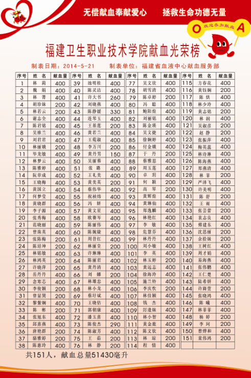 5月20日,我院與省血液中心聯(lián)合開展了無償獻血活動,這是學(xué)院生命健康教育月的又一主題活動。院紅十字會、學(xué)生會和血緣社社團積極宣傳并組織了本次活動。本次無償獻血活動從上午11點至下午4點,共計151人獻血51430毫升。