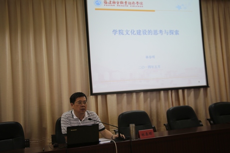 6月3日下午,學院黨委書記林春明應邀在行政樓六樓為全院師生作題為《學院文化建設的思考與探索》的講座。全院副高級以上職稱人員、副科級以上干部、教研室主任、輔導員及部分學生代表200多人聆聽了講座,講座由副院長廖偉堅主持。