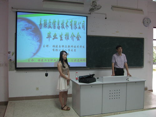 2013年6月25日下午,我院公共基礎(chǔ)部組織福建易聯(lián)眾軟件系統(tǒng)開發(fā)有限公司舉辦衛(wèi)生信息管理專業(yè)畢業(yè)生推介會。易聯(lián)眾人事專員蔡桂嬌介紹了本公司的概況,內(nèi)容包括企業(yè)文化、硬件產(chǎn)品介紹、軟件系統(tǒng)完善,以及公司招聘信息等,同時這也為本屆畢業(yè)生提供了更多的就業(yè)信息。(藥學(xué)系 公共基礎(chǔ)部)