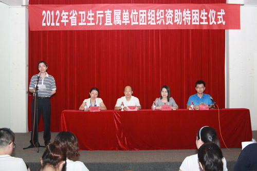 6月14日下午,2012年省衛(wèi)生廳直屬單位團(tuán)組織資助特困生儀式在我院明湖師生活動(dòng)中心隆重舉行。衛(wèi)生廳直屬單位各團(tuán)組織的代表和受資助學(xué)生參加了儀式。院黨委陳雄副書記、省衛(wèi)生廳團(tuán)委陳曉芩書記、院學(xué)工處黃銘珊處長(zhǎng)、院團(tuán)委宋維副書記出席。