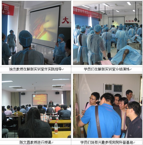 當天上午,培訓班在省立醫(yī)院舉行了簡短而熱烈的開班儀式,學院廖偉堅副院長、省立醫(yī)院繼續(xù)教育科王濤科長、省立醫(yī)院骨二科徐杰主任參加了開班儀式并分別講話。開班式后,蘭寶金、林院、陳文昌、施能木、徐杰等教授分別作了題為“髖關節(jié)生理及解剖結構”、“THA手術指征,假體選擇、模塊測量”、“髖關節(jié)置換圍手術期處理、全髖關節(jié)置換的并發(fā)癥處理”、“手術顯露與關閉傷口”和“髖臼側處理的原則和技巧、股骨側處理的原則和技巧及DDH伴OA的手術策略和總結”等內(nèi)容的講座,還安排進行病歷交流與討論,充分體現(xiàn)了基礎醫(yī)學與臨床醫(yī)學的接軌,理論與實踐的結合。中午,為了能多些實踐時間,學員和工作人員一行約50余人放棄午休時間,提前抵達我院。首先在解剖實訓室由徐杰教授作髖關節(jié)手術示范后,學員們分六組進行手術操作實踐。最后全體學員還參觀了我院省級科普實踐基地。學員們對我院省級科普實踐基地建設成果贊賞不已,在很多標本前駐足細看揣摩并拍照留影。