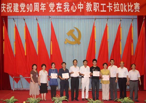 由院工會、團委、婦委會聯(lián)合舉辦的慶祝中國共產(chǎn)黨成立90周年“黨在我心中”教職工卡拉ok比賽日前圓滿結束,9個工會小組選送的16位選手參加了比賽,施漢生老師榮獲一等獎,林宇、洪常青老師獲二等獎,馬少寧、柯仁懷、邱麒老師獲三等獎。院領導嚴肅書記、陳雄副書記、黃開良、魏立娜副院長為獲獎者頒獎,嚴書記還應邀登臺深情演唱《繡紅旗》,贏得滿場掌聲。比賽自始至終氣氛熱烈,歌聲和掌聲表達了學院師生員工對黨的熱愛和祝福。 (工會 團委 婦委會)