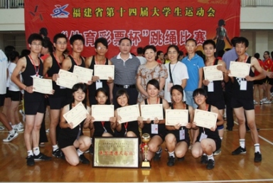 由福建省教育廳、福建省體育局主辦,福建體育職業(yè)技術(shù)學(xué)院承辦的福建省第十四屆大學(xué)生運(yùn)動(dòng)會(huì)跳繩比賽于2010年7月27日~8月1日舉行,高職高專院校組有33所高職高專院校、358名運(yùn)動(dòng)員參加了13個(gè)單項(xiàng)和1個(gè)團(tuán)體項(xiàng)目,是參加院校及人數(shù)最多的組別。