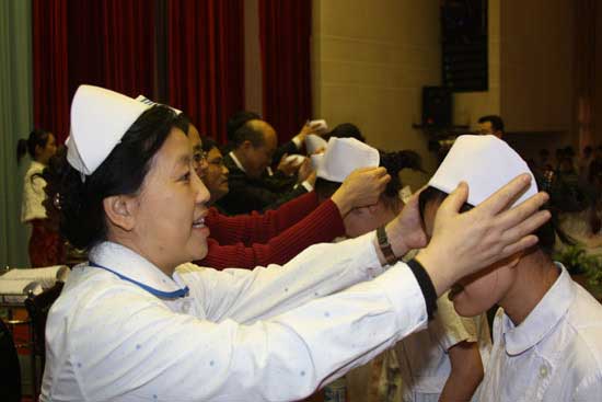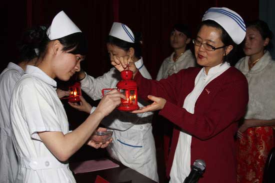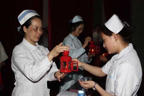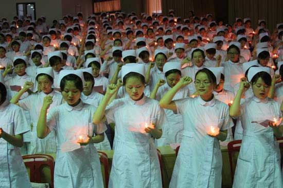 “我宣誓,遵守護(hù)士的職業(yè)道德規(guī)范,象南丁格爾那樣,以一顆同情心和一雙愿意工作的手,以真心、愛心和責(zé)任心對(duì)待每一位病人……”5月11日下午,在學(xué)術(shù)報(bào)告廳,護(hù)理系583位畢業(yè)生戴著象征著圣潔的天使的潔白燕帽,接過前輩象征著“燃燒自己,照亮他人”的紅燭,舉起右手,莊嚴(yán)宣讀畢業(yè)生誓詞。