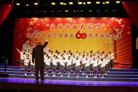 9月15日下午,省衛(wèi)生廳舉辦的迎國(guó)慶60周年“愛(ài)國(guó)歌曲大家唱”歌詠比賽在福州大戲院隆重舉行,來(lái)自衛(wèi)生系統(tǒng)的17個(gè)參賽隊(duì)伍以飽滿的熱情,演唱了《歌唱祖國(guó)》、《保衛(wèi)黃河》、《天路》、《在太行山上》等膾炙人口的愛(ài)國(guó)經(jīng)典歌曲,唱響了中華人民共和國(guó)成立60周年的光輝歷程和改革開(kāi)放的輝煌巨變,醫(yī)務(wù)工作者們以歌聲表達(dá)了愛(ài)國(guó)情懷,展示了推進(jìn)衛(wèi)生事業(yè)發(fā)展、服務(wù)海峽西岸經(jīng)濟(jì)區(qū)建設(shè)的堅(jiān)定信念。