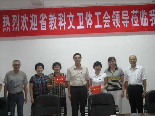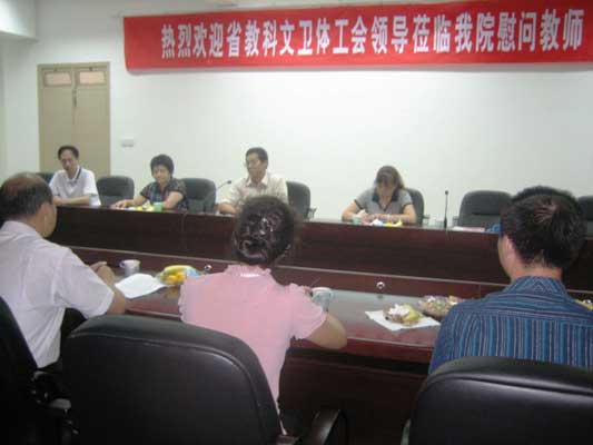 為慶祝第25個教師節(jié),省教科文衛(wèi)體工會領導副主任張元敏、張洪璇、趙毅、副處調(diào)研員趙瑞英及省直醫(yī)務工會領導一行五人于2009年9月8日下午到我院慰問教師。我院陳雄副書記及獲省優(yōu)秀教師稱號的林志明、謝濤等十位老師參加了座談會。