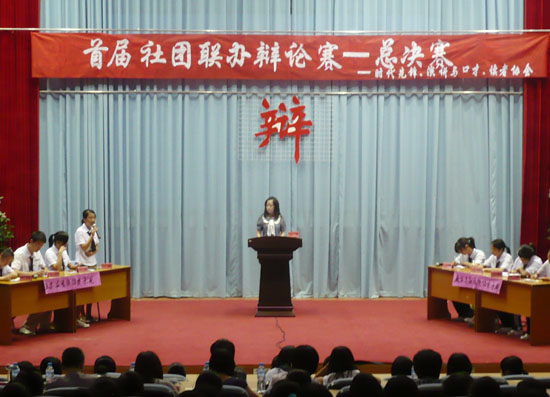 我院團(tuán)委組織院社團(tuán)部的時(shí)代先鋒社、演講與口才俱樂部和院讀者協(xié)會(huì)三個(gè)學(xué)生社團(tuán),于6月2日15:00在學(xué)術(shù)廳舉辦首屆社團(tuán)辯論賽總決賽。