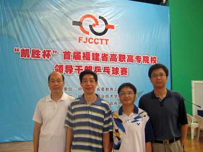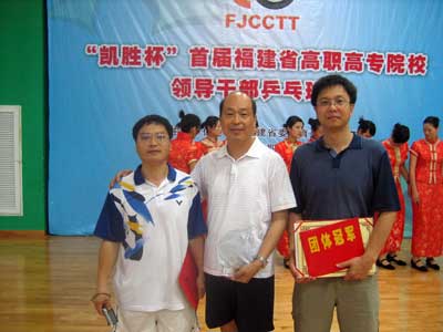 首屆全省高職高專院校領(lǐng)導(dǎo)干部乒乓球比賽,經(jīng)過兩天激烈爭奪于昨日(25日)降下帷幕。我院派出的陳雄、廖偉堅(jiān)、黃開良三位領(lǐng)導(dǎo)干部在球場上奮力拼搏,揚(yáng)長避短,不怕疲勞,機(jī)智果敢,戰(zhàn)勝了十八支來參戰(zhàn)的單位,最終贏得了團(tuán)體賽冠軍。為我院爭得這次比賽的最高榮譽(yù)。