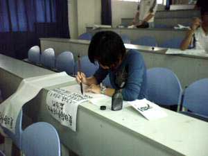 為豐富同學們的課余活動,提高對中國書法的鑒賞能力,同時發(fā)掘系部書法方面的優(yōu)秀人才,檢驗影像系于2007年10月11日下午4:00在系二階教室舉行書法比賽。本次比賽共收到參賽作品50余件,其參賽作品之多,書法技藝之高超,令評委驚喜。經過評委的認真評選,最終評出一等獎2名,二等獎4名,三等獎6名,優(yōu)秀獎8名,所有的獲獎者都將獲得相應的素質拓展加分。(檢驗影像系)