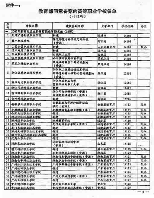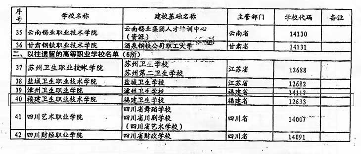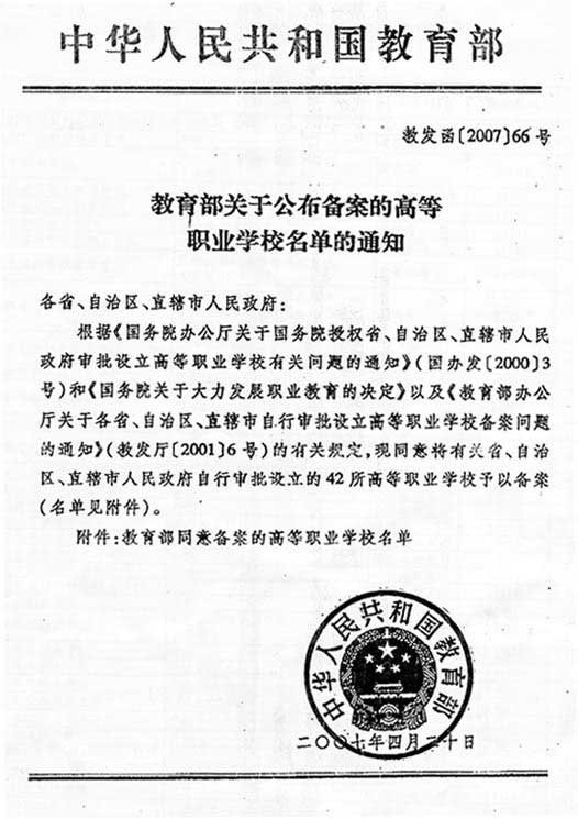 教育部于2007年4月20日下發(fā)《關于公布備案的高等職業(yè)學校名單的通知》(教發(fā)函〔2007〕66號),同意將我校予以備案,學校名稱:福建衛(wèi)生職業(yè)技術學院,學校代碼:12633。