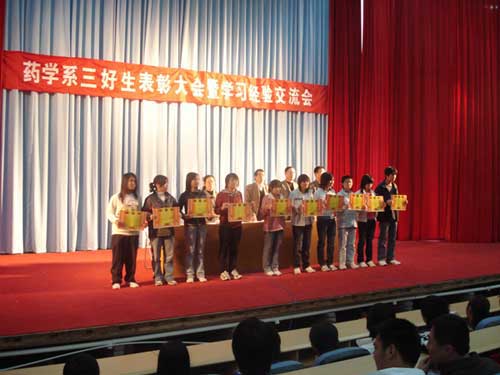 大會在莊嚴(yán)肅穆的國歌聲中拉開了帷幕,接著藥學(xué)系歐春木書記公布了2006~2007學(xué)年第一學(xué)期三好生名單和文明宿舍名單,宣讀了對這些同學(xué)和宿舍的表彰決定。隨后進行頒獎儀式,受表彰先進個人和宿舍代表上臺領(lǐng)獎,領(lǐng)獎完,謝君妹等五位同學(xué)先后上臺發(fā)言,分享自己的學(xué)習(xí)心得和成功經(jīng)驗。之后,學(xué)工處鄭力宏處長發(fā)表了講話, 祝賀受表彰的同學(xué),希望他們能夠再接再厲,取得更好的成績,同時也對同學(xué)提出了做為優(yōu)秀學(xué)生的幾點要求。