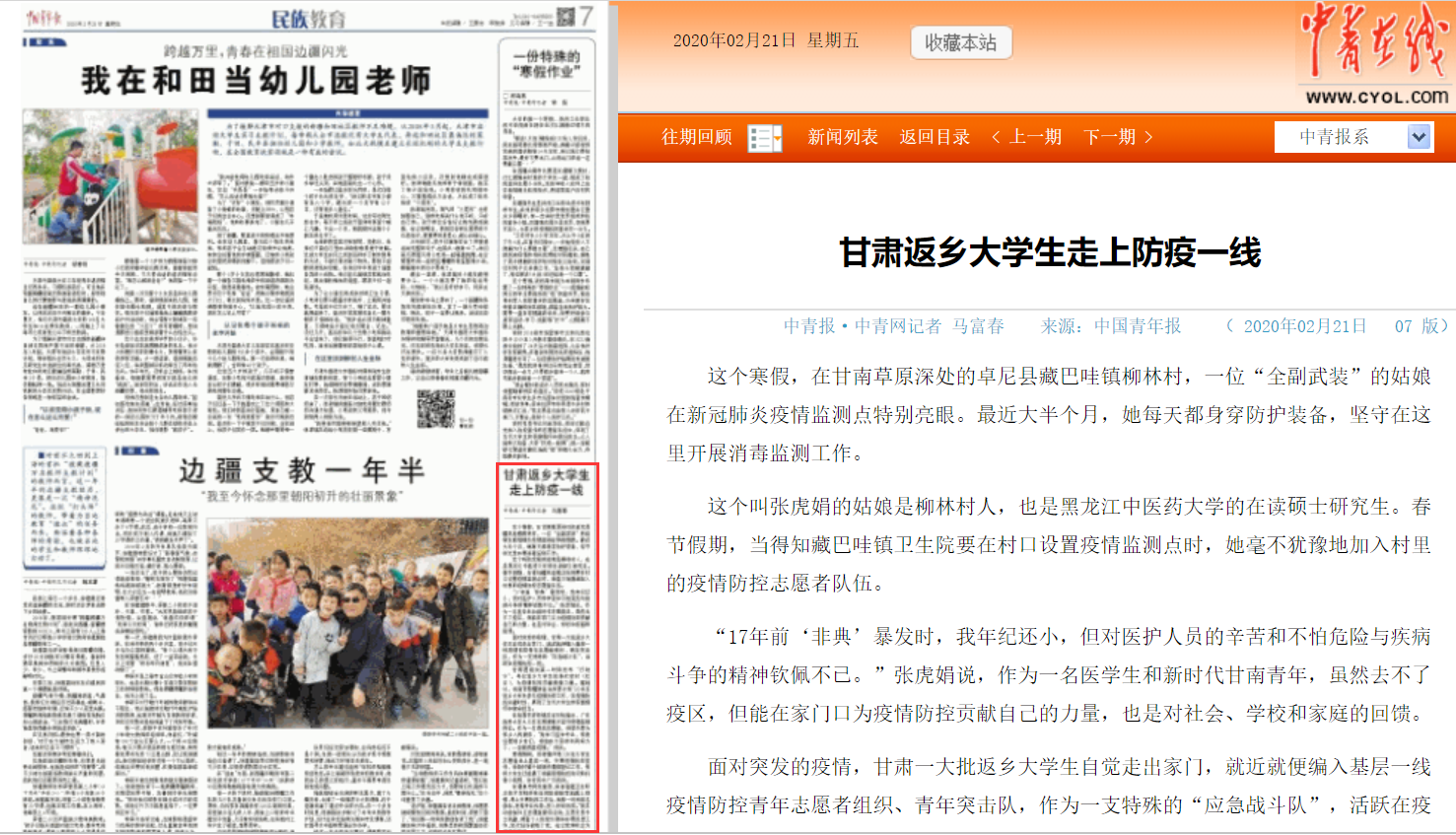 “17年前‘非典’暴發(fā)時,我年紀還小,但對醫(yī)護人員的辛苦和不怕危險與疾病斗爭的精神欽佩不已?!睆埢⒕暾f,作為一名醫(yī)學生和新時代甘南青年,雖然去不了疫區(qū),但能在家門口為疫情防控貢獻自己的力量,也是對社會、學校和家庭的回饋。