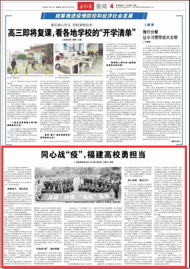 這是一場只能贏不能輸?shù)膽?zhàn)斗。 從醫(yī)療救治到馳援一線,從檢測研發(fā)到科學(xué)預(yù)防……自新冠肺炎疫情發(fā)生以來,我省高校積極投身、統(tǒng)籌推進(jìn)疫情防控和經(jīng)濟(jì)社會發(fā)展,與全省人民同舟共濟(jì),揚(yáng)起命運(yùn)與共、共克時(shí)艱的精神風(fēng)帆。 面對疫情,迎難而上!我省高校交出了一份出色的答卷! 英雄逆行 高校擔(dān)當(dāng) 關(guān)鍵時(shí)刻挺身而出的,是英雄。 在這次教育系統(tǒng)防疫戰(zhàn)役中,高校的力量舉足輕重,高校師生不僅守好了校園,還沖在了防疫第一線。我省多家高校附屬醫(yī)院積極參加援鄂醫(yī)療隊(duì)、承擔(dān)省內(nèi)防疫醫(yī)療任務(wù),成為抗擊疫情的重要生力軍! “不忘初心,完成使命,平安歸來!”3月24日,作為福建省首批支援湖北醫(yī)療隊(duì)隊(duì)員歸來的林忠厚感慨地說。 大年初二,得知福建省組建援鄂醫(yī)療隊(duì),福建醫(yī)科大學(xué)附屬第一醫(yī)院急診科副護(hù)士長林忠厚第一時(shí)間向院黨委遞交“請戰(zhàn)書”。大年初三,他辭別父母和妻兒,隨團(tuán)馳援武漢。在武漢金銀潭醫(yī)院,林忠厚作為小組長負(fù)責(zé)綜四病區(qū)工作。他不怕苦、不怕累,每天都沖鋒在第一線、戰(zhàn)斗在最前沿。 據(jù)了解,新冠肺炎疫情發(fā)生后,福建醫(yī)科大學(xué)積極響應(yīng)黨中央的號召,按照省委省政府的要求,充分發(fā)揮學(xué)科專業(yè)優(yōu)勢,積極履行服務(wù)社會、服務(wù)師生的使命與擔(dān)當(dāng)?!敖刂?月28日,學(xué)校附屬醫(yī)院已累計(jì)有385名醫(yī)護(hù)人員前往湖北進(jìn)行支援,他們舍小家為大家,義無反顧逆行而上?!备=ㄡt(yī)科大學(xué)黨委副書記黃愛民說。 “專業(yè)對口,無怨無悔?!薄按蠹也灰獱幜?,我身體最壯,我去最適合!”“國家需要,義不容辭!”……接到上級通知,福建中醫(yī)藥大學(xué)附屬醫(yī)院的醫(yī)護(hù)人員主動(dòng)請戰(zhàn)一線。 據(jù)了解,福建中醫(yī)藥大學(xué)四家直屬附屬醫(yī)院共分批派出102名醫(yī)護(hù)人員增援武漢、宜昌,弘揚(yáng)大醫(yī)精神、貢獻(xiàn)中醫(yī)智慧,在湖北抗疫一線發(fā)揮了重要作用。“福建中醫(yī)人充分發(fā)揮了中醫(yī)藥在疫情防控方面的特色優(yōu)勢,并取得了良好的療效,得到了兄弟省份和同行的廣泛好評。此外,學(xué)校還充分發(fā)揮專家作用,通過遠(yuǎn)程會診等形式,為戰(zhàn)勝疫情獻(xiàn)策獻(xiàn)力?!备=ㄖ嗅t(yī)藥大學(xué)校長李燦東教授告訴記者。 “我曾在武漢求學(xué),此去更加義無反顧。”這是福建省首批馳援武漢的廈門大學(xué)附屬第一醫(yī)院醫(yī)生趙貫金出征前的誓言,他說,支援武漢的消息一經(jīng)傳出,他就毫不猶豫地寫下了請戰(zhàn)書。 從三尺講臺到戰(zhàn)“疫”陣地,從各自崗位到武漢前線,師生校友化身戰(zhàn)士,高校學(xué)府皆成砥柱,筑起了守護(hù)生命的白衣長城。 科學(xué)戰(zhàn)“疫” 高校智慧 戰(zhàn)勝疫情離不開科技支撐。在這場疫情防控阻擊戰(zhàn)中,我省高校沖在疫情防控、臨床診治、科學(xué)研究的第一線,勇于擔(dān)當(dāng)、積極作為,取得重要階段性成果,充分體現(xiàn)了近年來我省推進(jìn)高??萍俭w制機(jī)制改革創(chuàng)新的成效。 “一滴指尖血,十分鐘檢測?!?月10日,福州大學(xué)宣布,該校與廈門寶太生物科技有限公司合作研發(fā)的新冠病毒檢測試劑盒獲歐盟CE準(zhǔn)入,將正式投放歐洲市場,月產(chǎn)能可達(dá)300萬人份以上! “該試劑盒采用膠體金法,具有很高的靈敏度和特異性,可用于體外定性檢測血漿、全血樣本中的SARS-CoV-2冠狀病毒IgG/IgM抗體。產(chǎn)品即采即測,無需輔助儀器,可肉眼判斷,10分鐘即可得出檢測結(jié)果?!备V荽髮W(xué)食品安全與生物分析教育部重點(diǎn)實(shí)驗(yàn)室、福建省健康智能診斷技術(shù)工程研究中心林振宇教授表示。目前試劑盒已在福建三家定點(diǎn)醫(yī)院經(jīng)過初步臨床驗(yàn)證,“下一步,我們的目標(biāo)是產(chǎn)品能在國內(nèi)市場上市”。 無獨(dú)有偶,3月6日,廈門大學(xué)國家傳染病診斷試劑與疫苗工程技術(shù)研究中心夏寧邵團(tuán)隊(duì)等聯(lián)合研制的新型冠狀病毒(2019-nCoV)抗體檢測試劑盒,也正式獲準(zhǔn)上市并已完成產(chǎn)業(yè)化,月產(chǎn)能超100萬人份。據(jù)了解,這也是國內(nèi)外首個(gè)獲批的雙抗原夾心法總抗體檢測試劑。 “新冠病毒檢測試劑盒,具有靈敏度高、特異性好、隨到隨檢、全自動(dòng)高通量、29分鐘出結(jié)果等優(yōu)點(diǎn),結(jié)合核酸檢測,可用于臨床病例和疑似病例的檢測以及特殊高危人群的篩查,大大提高了一線醫(yī)療機(jī)構(gòu)的檢測效率?!睆B門大學(xué)相關(guān)研究人員表示。 早預(yù)防,是打贏疫情防控阻擊戰(zhàn)的關(guān)鍵之一。面對疫情,我省各高校綜合運(yùn)用多種手段,加強(qiáng)對新冠肺炎的預(yù)防。 福建高校網(wǎng)上紅色書屋推出疫情防控專欄,上架《新型冠狀病毒肺炎預(yù)防手冊》《新型肺炎權(quán)威解讀》等67本疫情防護(hù)相關(guān)圖書,普及疫情防控專業(yè)知識,得到學(xué)生的追捧。 閩江學(xué)院、莆田學(xué)院等高校創(chuàng)立“防疫知識驛站”,建立《以愛防疫,“易”起同行》公開課群,集中
