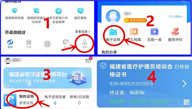 證書領取步驟:1.學員只需下載“閩政通”app登錄后點擊“我的”;2.點擊“電子證照”;3.點擊“我的證照”即可查看。