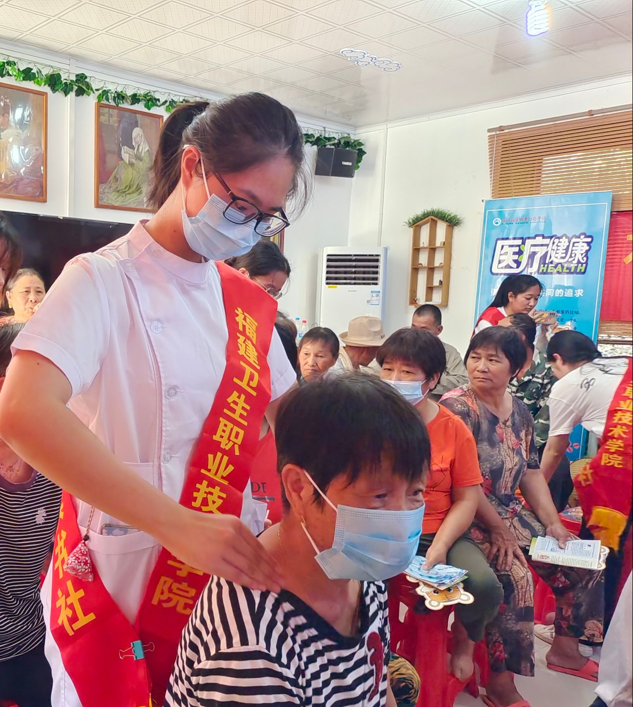 “思政+專業(yè)”是福建衛(wèi)職院思政實踐教學(xué)特色之一,在發(fā)揮專業(yè)所長的社會實踐中進(jìn)行思政價值引領(lǐng),讓實踐教學(xué)“接地氣”,讓思政元素“自然流露”,讓思政育人“水到渠成”?!靶聲r代醫(yī)學(xué)生如何助力健康中國戰(zhàn)略?”以此為切入點,24位醫(yī)學(xué)生為村民提供醫(yī)學(xué)咨詢、中醫(yī)推拿、示范培訓(xùn)、血壓測量、專家義診等醫(yī)療服務(wù),對預(yù)防高血壓、糖尿病等慢性病、常見病進(jìn)行健康科普,在“我為群眾辦實事”中踐行醫(yī)者初心,體悟醫(yī)者使命?!拔覑廴税c瘓臥床,他要是能來現(xiàn)場就好了!”活動現(xiàn)場村民江本松的妻子感慨到。實踐隊了解情況后,從家里接來了江本松老人,在詳細(xì)了解病情之后,為其進(jìn)行肢體的被動活動和四肢牽伸,并細(xì)致提供康復(fù)保健建議?,F(xiàn)場“插曲”成為了生動鮮活的育人育才素材。通過愛心義診,隊員們深有感悟:所謂“醫(yī)者藝也,醫(yī)者仁也”,將醫(yī)學(xué)探究到極致,從而惠及眾生是我們作為未來醫(yī)者的畢生所求,我們應(yīng)精進(jìn)醫(yī)學(xué)技術(shù),不斷提升服務(wù)態(tài)度,為患者身體健康保駕護(hù)航,為祖國醫(yī)學(xué)事業(yè)的發(fā)展盡綿薄之力。
