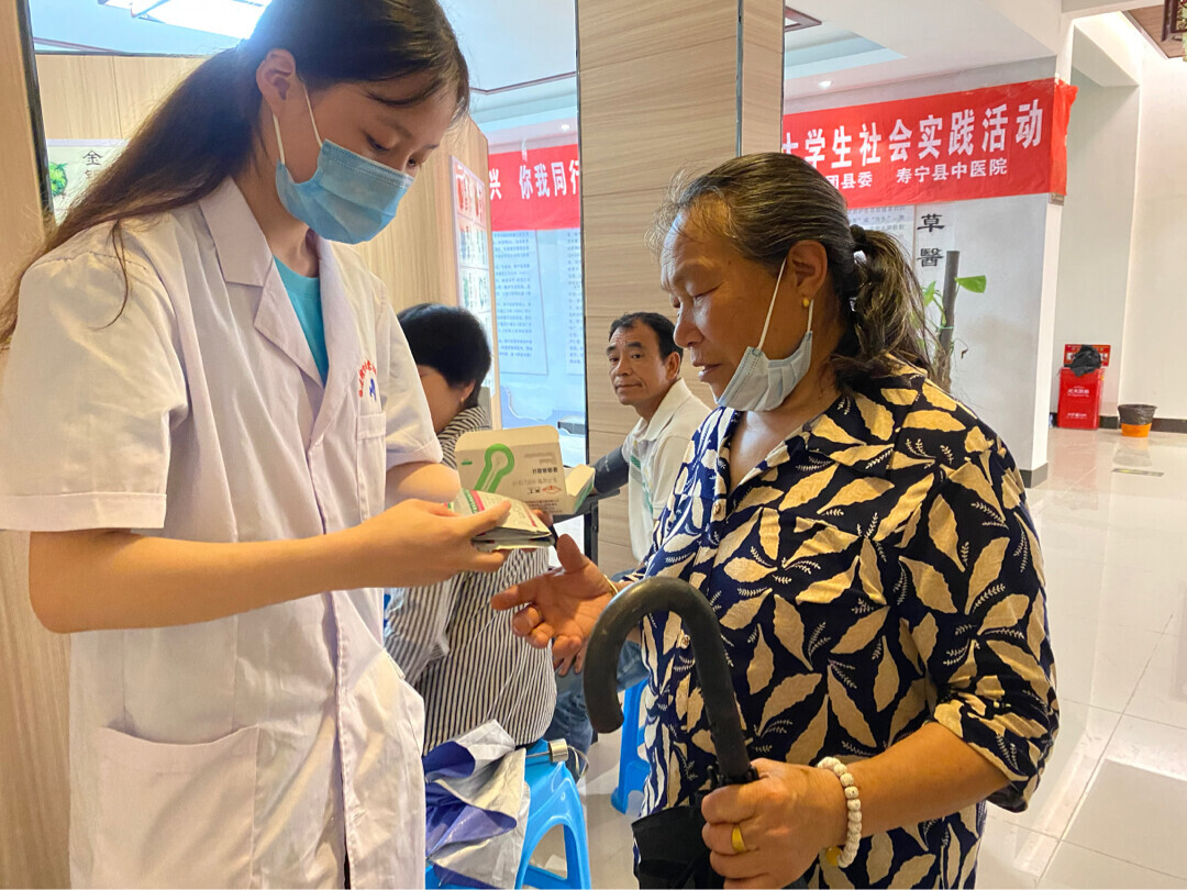 圖為小隊成員為前來體驗的村民發(fā)放醫(yī)療物品。中國青年網(wǎng)通訊員 趙夢雅 攝