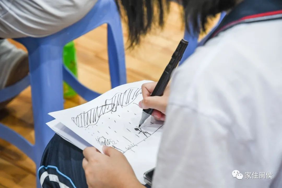 ▲(同學(xué)在紙上畫出腦海里“雨中人”的畫面)